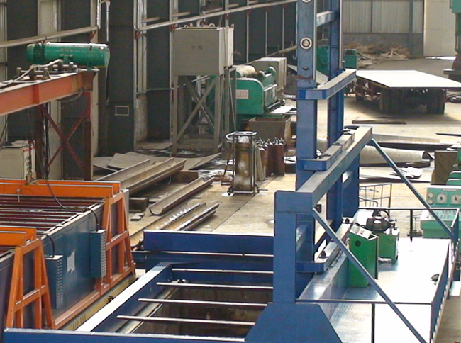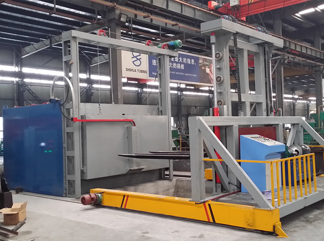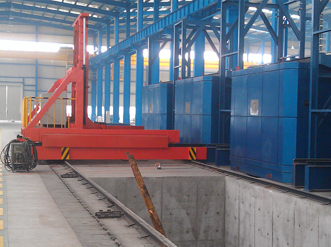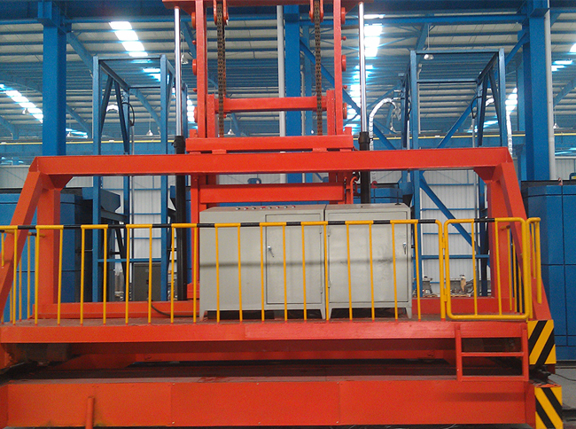 專用鏟車設(shè)置于淬火爐前方,具有獨(dú)立的軌道及傳動(dòng)裝置,可以承載工件前后進(jìn)出、左右平移及上下升降。一臺(tái)鏟車可供淬火爐和回火爐使用。